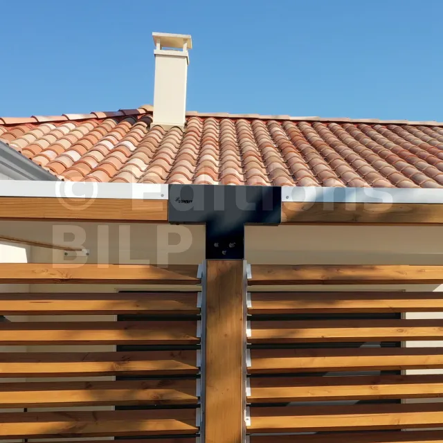 Il permet de raccorder une poutre de 90x90mm perpendiculairement à un chevron de 90x90mm, le tout étant supporté par un poteau vertical de 90x90mm.