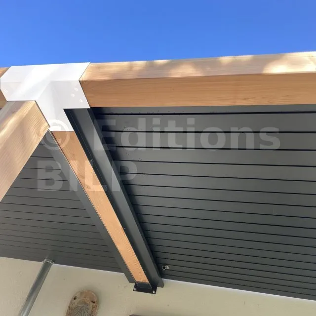 Il permet de raccorder une poutre de 90x90mm perpendiculairement à un chevron de 90x90mm, le tout étant supporté par un poteau vertical de 90x90mm.