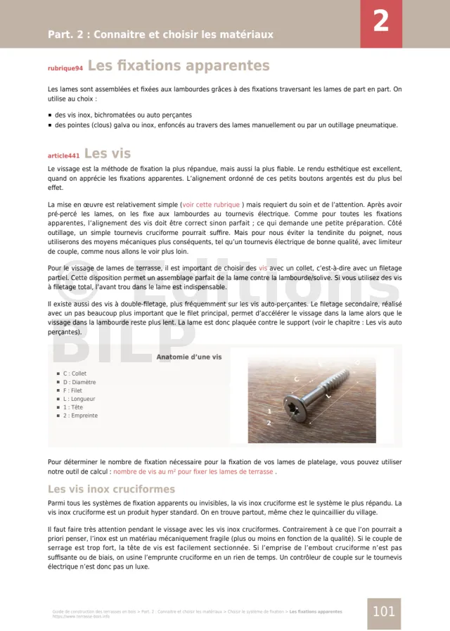 - vous ferez les bons choix de matériaux, les lames de terrasse, les lambourdes, les fixations, etc.