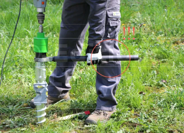 - La poignée permet à l’utilisateur de saisir l’outil fermement et d’appliquer le couple nécessaire pour visser la vis de fondation dans le sol. Sans une bonne poignée, il serait difficile d’exercer la force nécessaire pour enfoncer la vis.