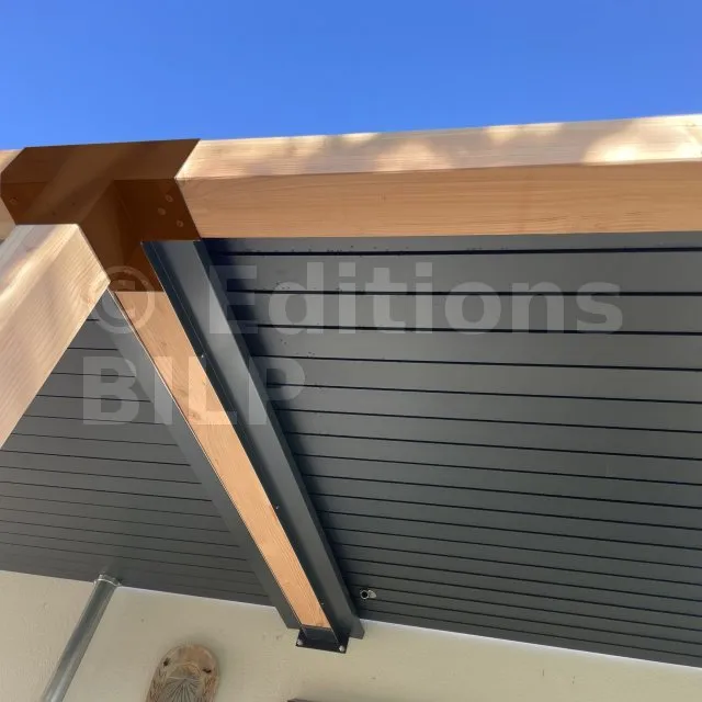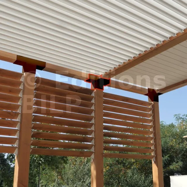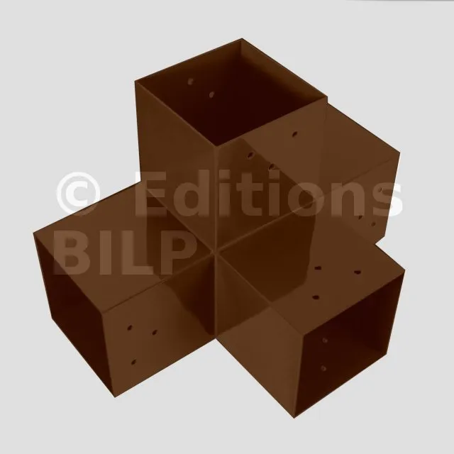 Il permet de raccorder une poutre de 120x120mm perpendiculairement à un chevron de 120x120mm, le tout étant supporté par un poteau vertical de 120x120mm.