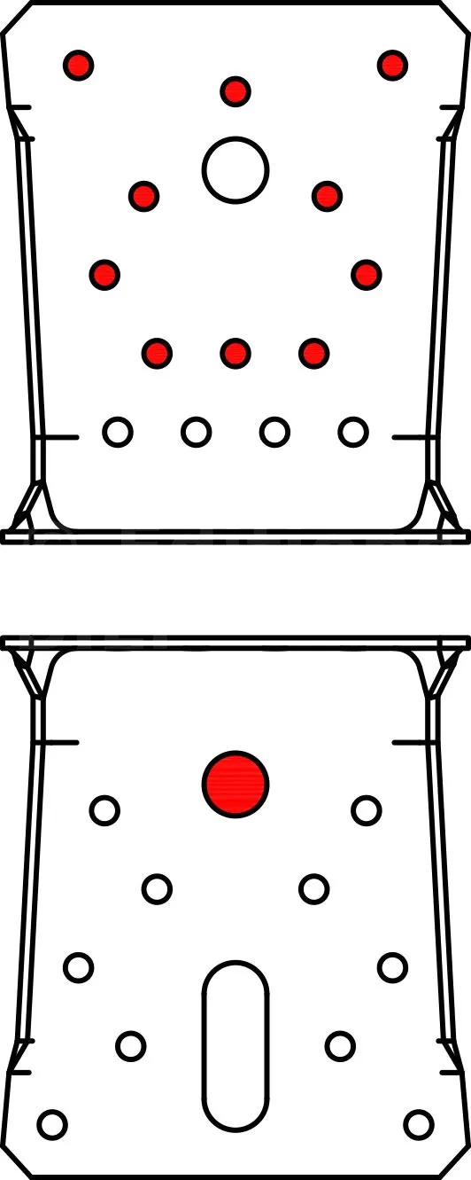 - Fixation BOIS/BOIS - clouage totalAile A : 10 ; Aile B : 14 ; type : Pointes annelées CNA Ø4.0x35 ou Ø4.0x50 mm, Vis CSA Ø5.0x35 ou CSA Ø5.0x40