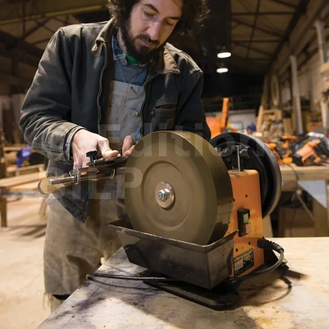 - Le bras de support et le gabarit d’affûtage pour outils droits permettent de conserver l’angle approprié.