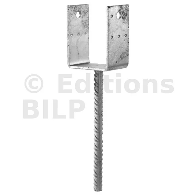 | Pieds de poteau en U à sceller – Réf. PPD70/70G, 80/70G, 90/70G, 100/70G, 120/90G, 140/90G‑R | Réglage de hauteur par tige • galvanisation à chaud 5 mm • largeurs 70→140 mm • forte reprise en soulèvement (≈2,8 t) • pose simple avant coulage. |