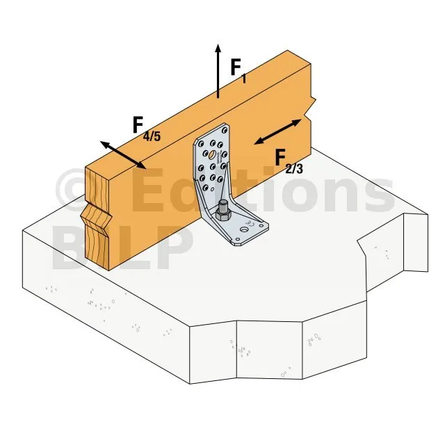 Voir la gamme d’ancrage Simpson Strong-Tie pour trouver le produit adéquat. Les solutions d’ancrage typiques sont BOAXII, SET-XP, WA, AT-HP et dépendent du type de béton, l’entraxe et les distances aux bords.