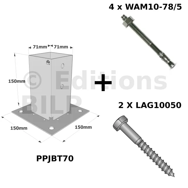 - 1 pied de poteau PPJBT70 ou PPJBT90 en acier galvanisé à chaud,