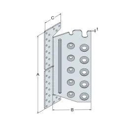 | Largeur | Hauteur | Largeur poteau | A | B | C | t | α [°] | Ø5 | Ø8,5 | Ø12,5 | ||||||