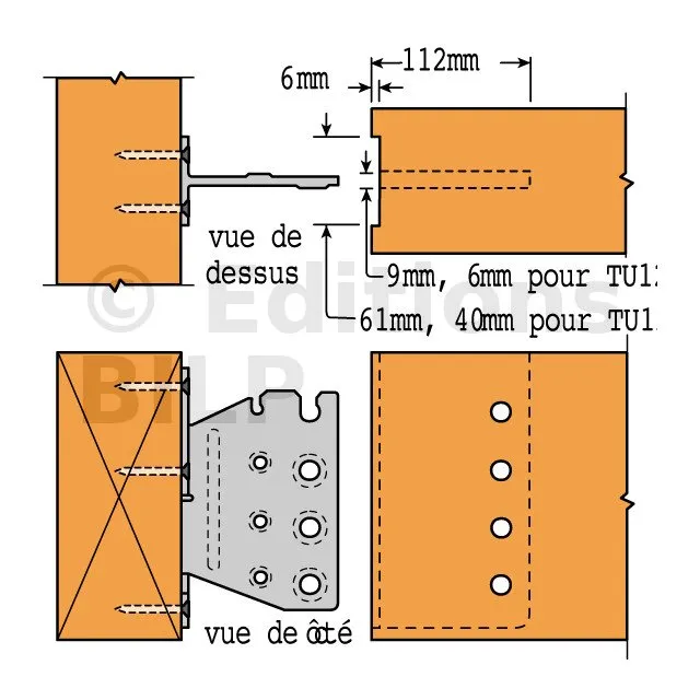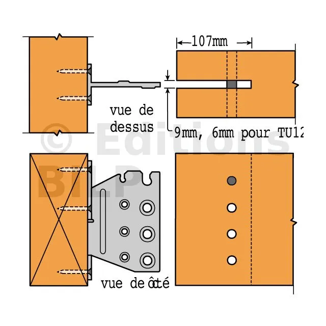 1- Réaliser une entaille verticale dans la poutre portée (largeur 6 mm pour le TUS12 et largeur 9 mm pour les TUS16 à TUS28),