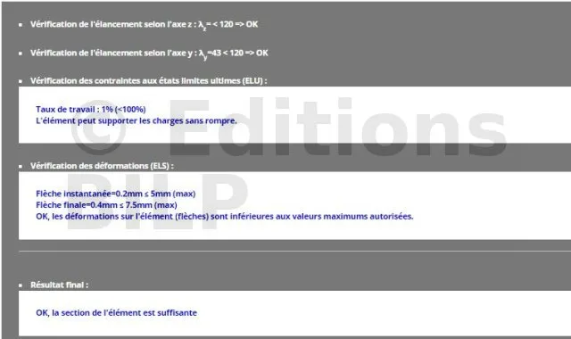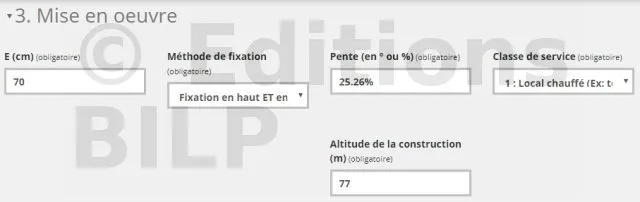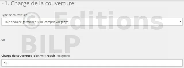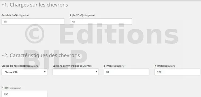 Considérons un bois massif de 500 kg/m3 de masse volumique (se renseigner auprès de votre fournisseur pour avoir cette valeur). Nous allons insérer cette valeur à notre calcul. Nous obtenons alors la masse des chevrons qui s’étalent sur un versant du toit : 10 U x 0.08 m x 0.12 m x 500 kg/m3 = 48 kg. Puisque nous n’avons pris que la moitié de notre toiture, la surface que nous prendrons en compte sera aussi la moitié de la surface totale, c’est-à-dire S/2 = 20.26 m². La charge permanente des chevrons sera de 2,40 kg/m², comme l’unité sur notre calculatrice est en daN/m, alors la charge permanente sur la poutre sera 2,40 kg/m² x 1m avec 1m l’entraxe entre les pannes ce qui nous donnera 2.40kg/m = 2.35daN/m (avec 1daN = 1.02kg).